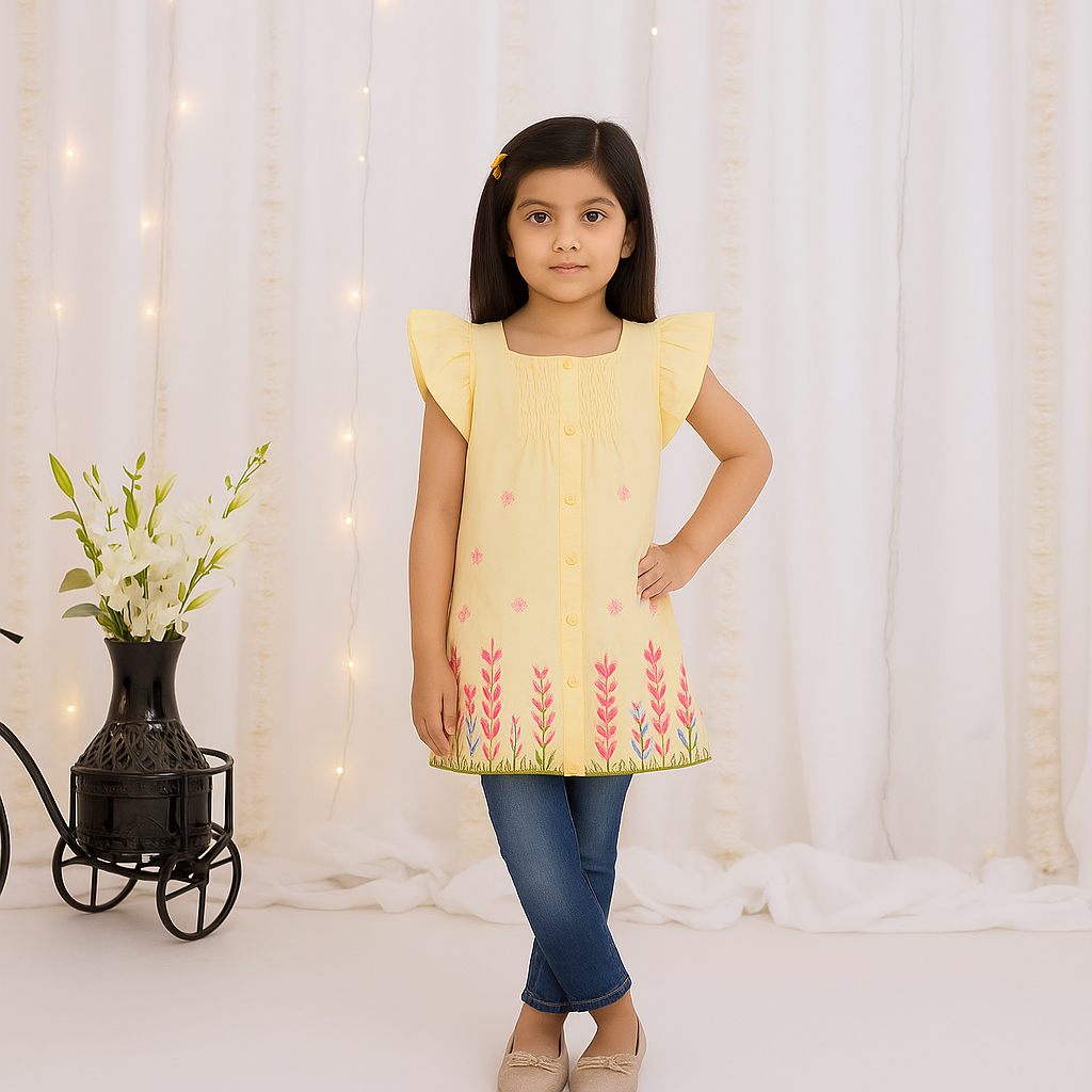Brighten up your wardrobe with this charming yellow off-shoulder top, designed for effortless style and comfort. Made from lightweight, breathable fabric, this top features delicate floral embroidery along the hem, adding a touch of elegance and vibrance. The ruffled flutter sleeves give it a playful yet sophisticated look, while the button-down front adds a stylish and practical detail.
